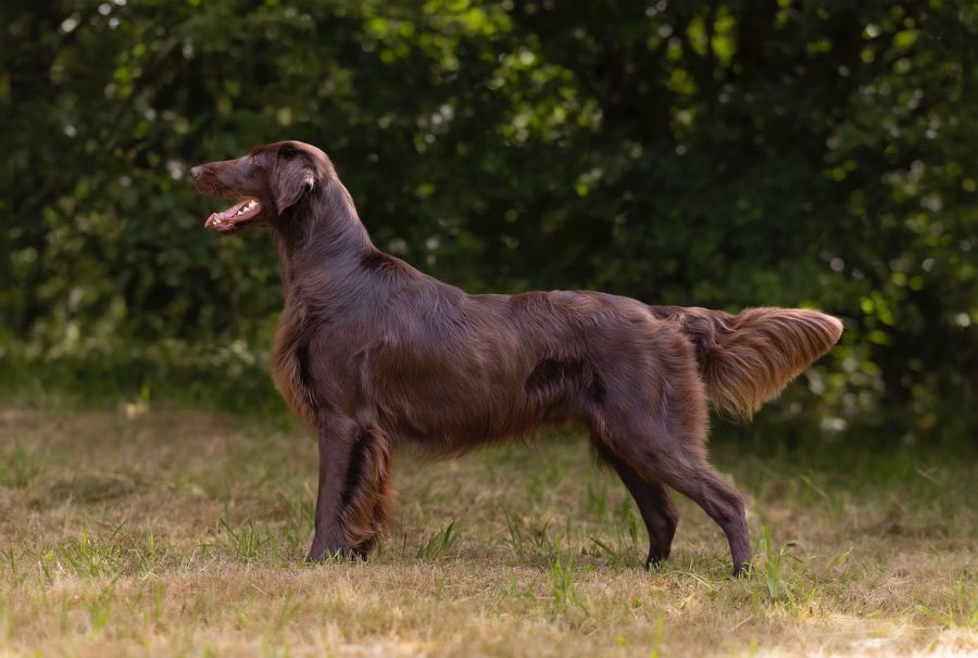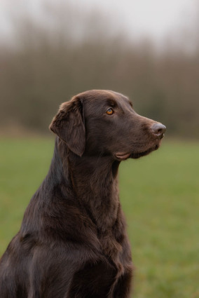 Der ein Jahr alte Flat Rüde zeigt sich heute sehr verspielt, hat ausgeprägtes Temperament und ist bewegungsfreudig.